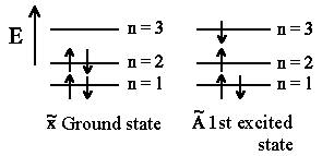 One can observe absorption spectra of polyenen and excitation energy ΔE that corresponds to energy difference between two successive states with (n+1) and n. We will assign the highest energy level in the ground state that is occupied by electrons as HOMO (highest occupied molecular orbital). For butadien it's n = 2. The energy level that lays upper than HOMO (it is n+1=3 for butadien) is also referred to as LUMO (lowest unoccupied molecular orbital). According to Pauli exclusion principle we can put at most 2 electrons having opposite directed spins (spin up and spin down) on one level. Hence total number of double bindings corresponds directly to n and finally we obtain ΔE = En+1 − En as energy difference between successive levels: