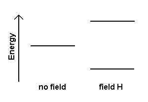 When a nucleus with a non-zero spin is placed in a magnetic field, the nuclear spin can align in either the same direction or in the opposite direction as the external magnetic field. A nucleus that has its spin aligned with the external field will have a lower energy than when it has its spin aligned in the opposite direction to the field. Thus, these two nuclear spin alignments have different energies and application of a magnetic field results in an energy level diagram like: